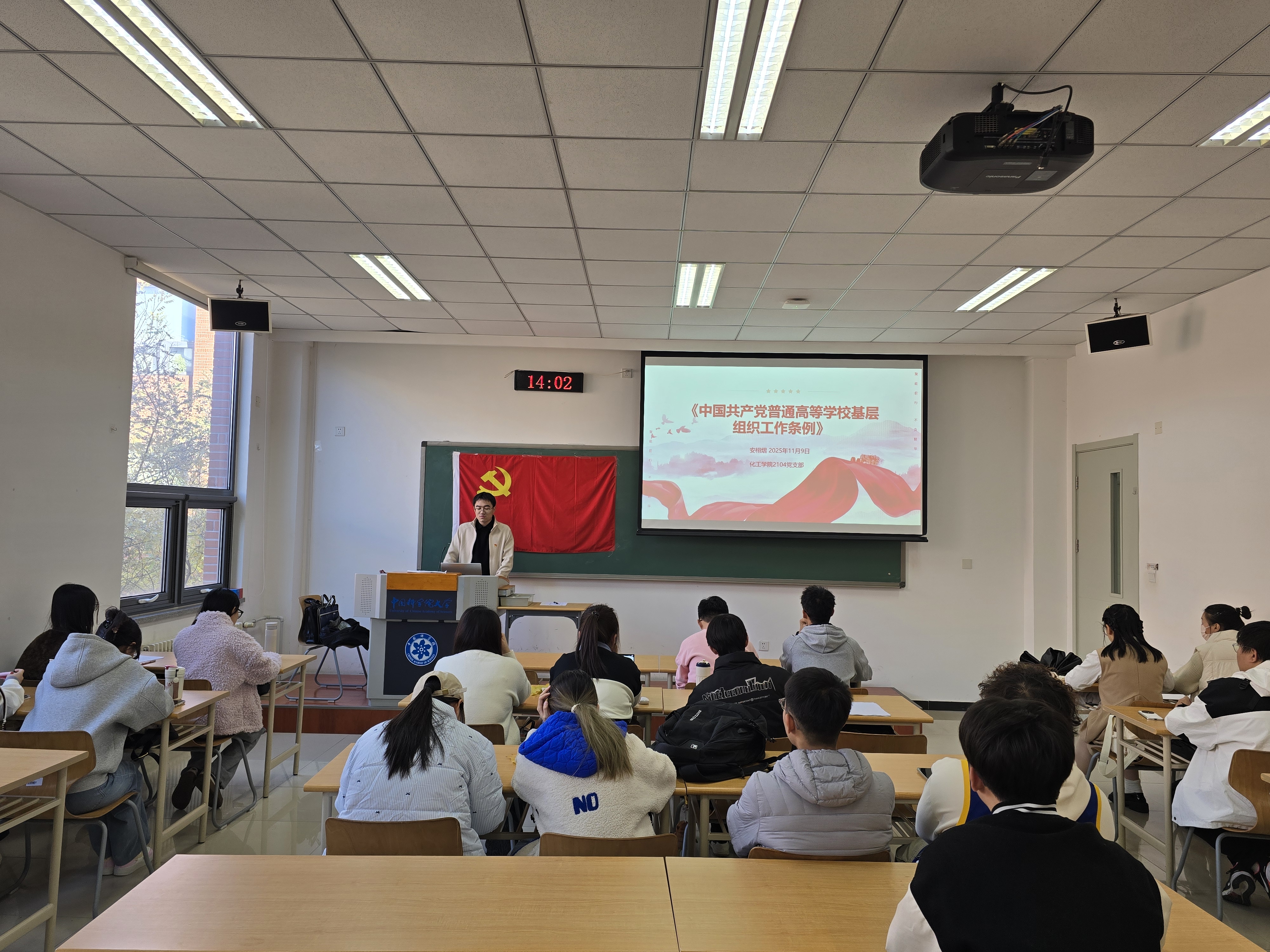 会议第一阶段为理论学习。安栩熠同志领学《中国共产党普通高等学校基层组织工作条例》,强调高校党组织在思想政治引领和基层组织建设中的重要作用。