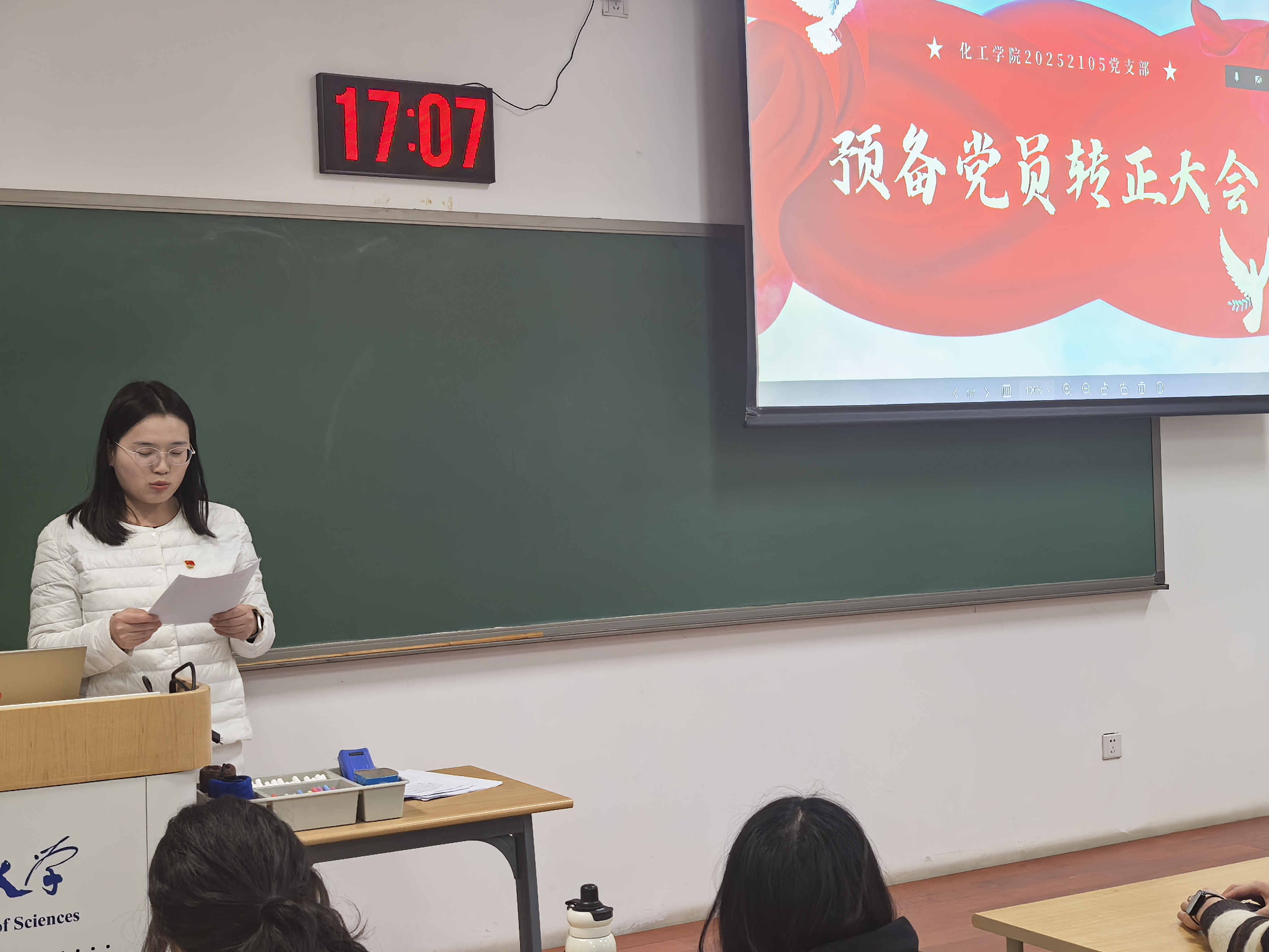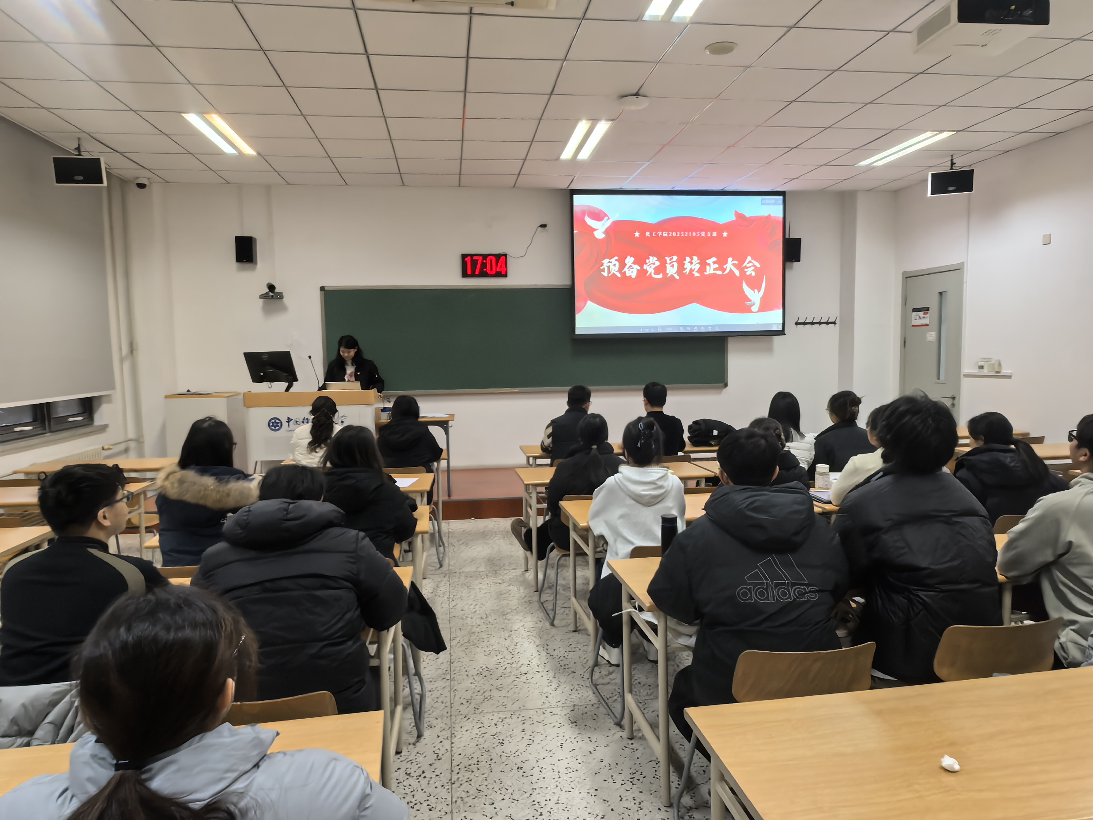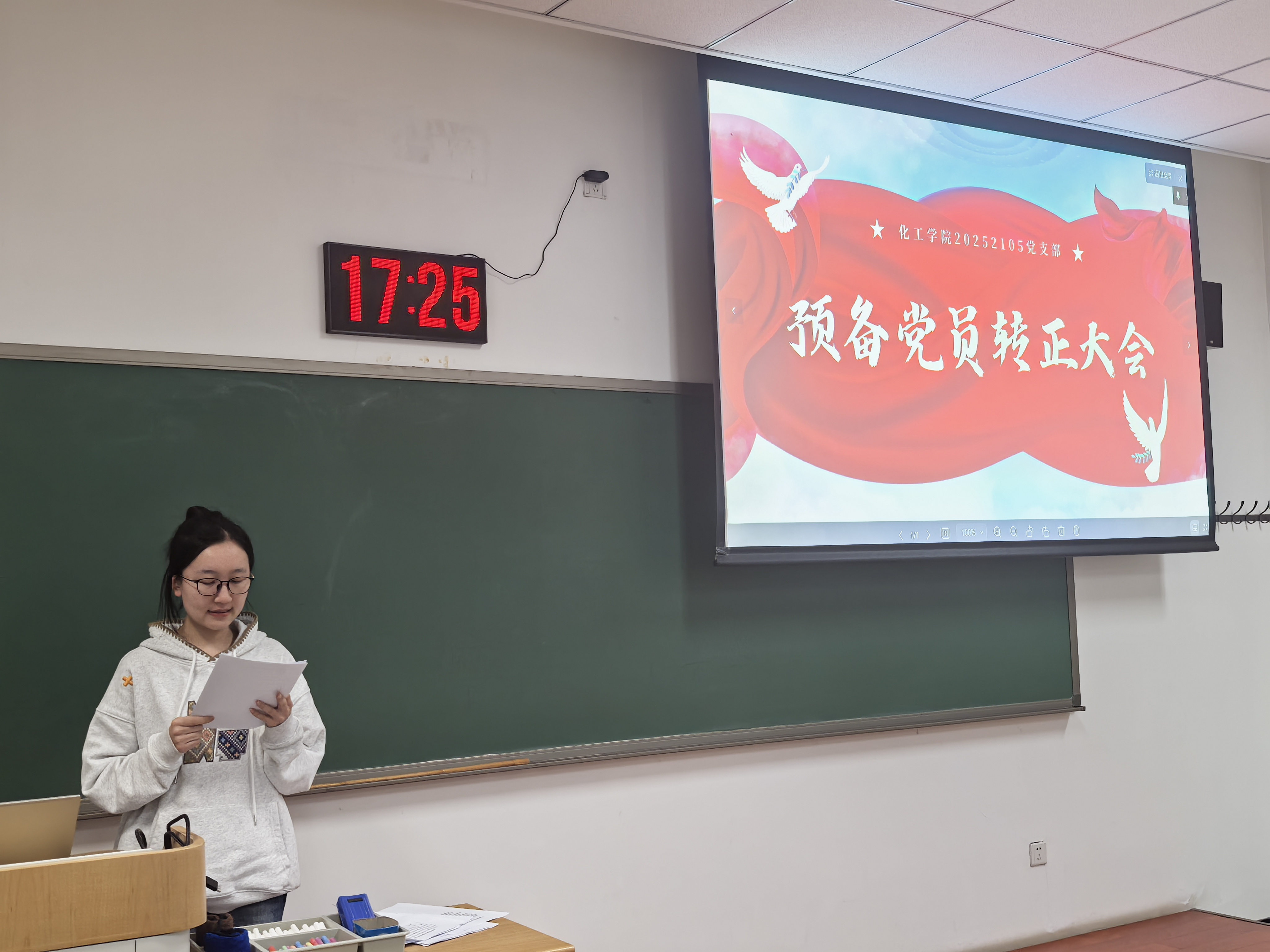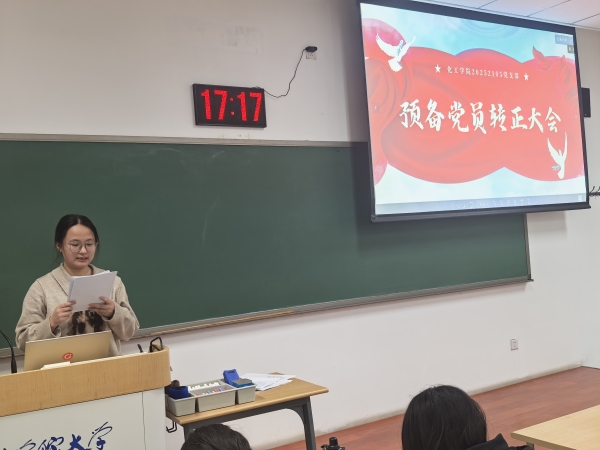 为深入学习贯彻党的创新理论,严把党员发展“入口关”,锻造先锋模范队伍,2025年12月24日,化学工程学院20252105党支部于教二218教室召开预备党员转正大会,审议并表决候晓敏、吕依然、柴楠三位同志的转正事宜。大会由党支部书记袁丽娟同志主持,化学工程学院20252105班主任原旭冰同志列席指导。