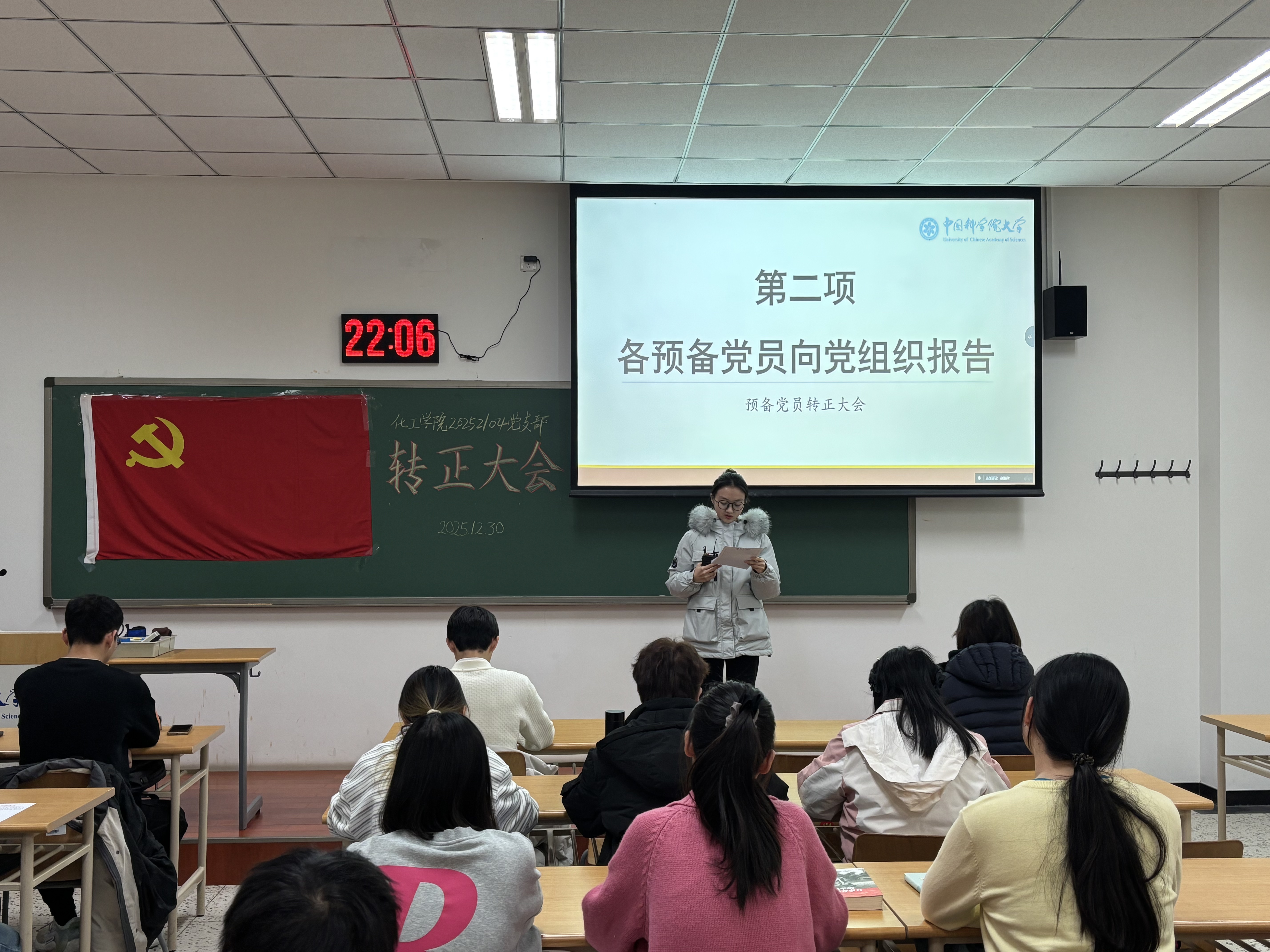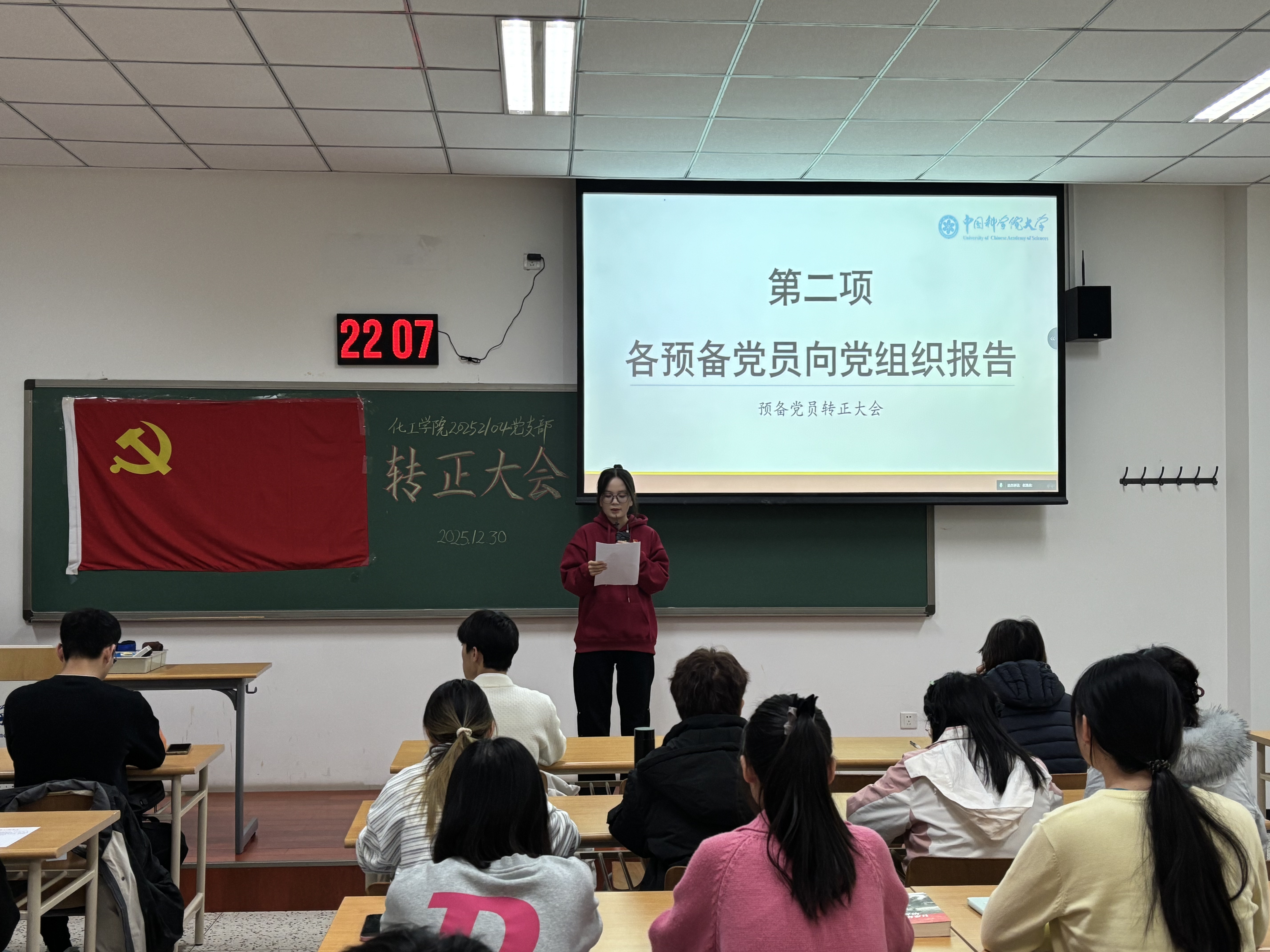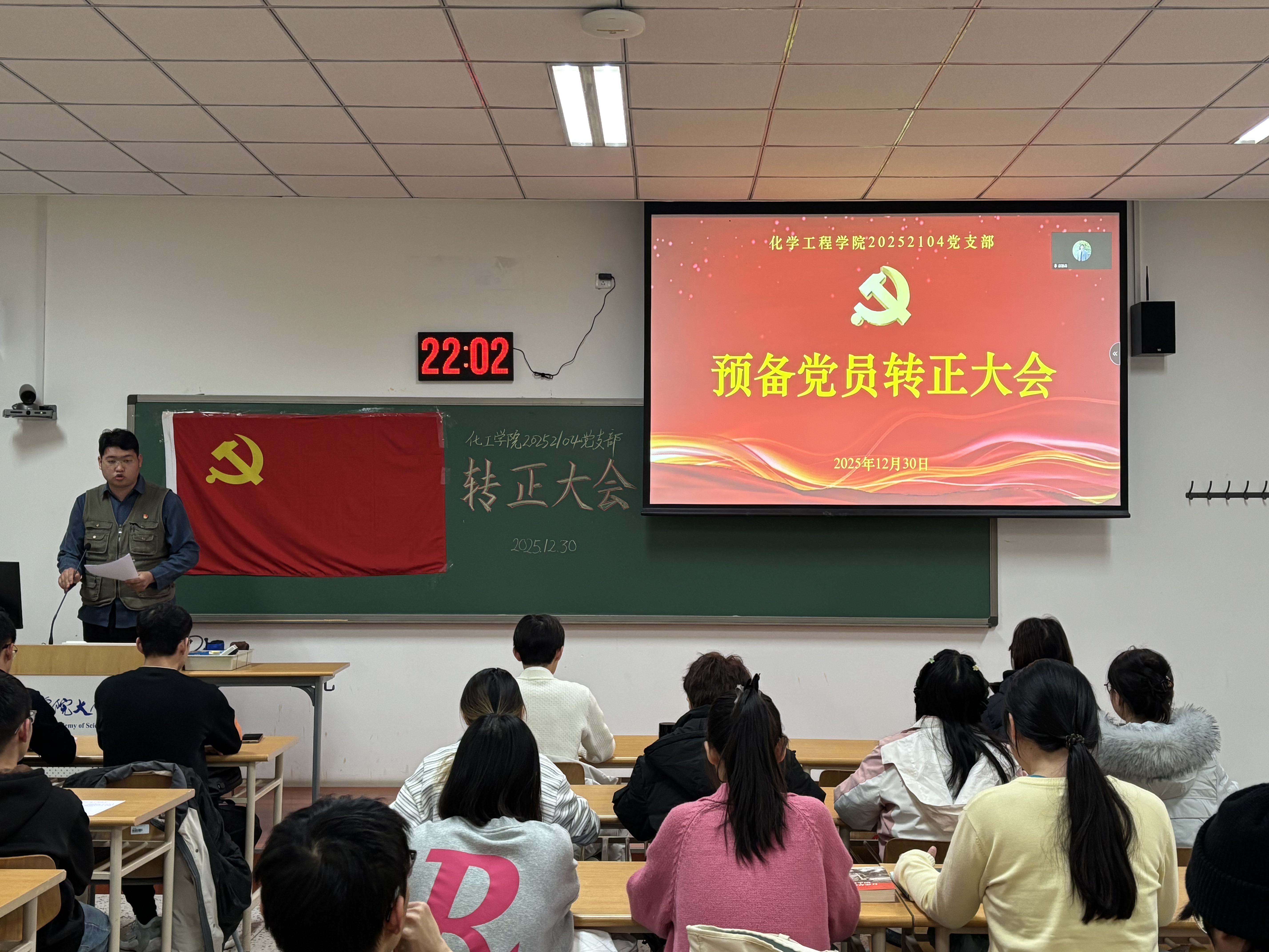 2025年12月30日,化工学院20252104党支部于教2楼221室召开预备党员转正大会,会议严格按照《中国共产党发展党员工作细则》相关规定,对张飘、赵小媛、于淼、陈超四位同志的转正事宜进行了充分讨论与表决。支部22名党员参加本次会议,大会由支部书记赵浩淼主持。