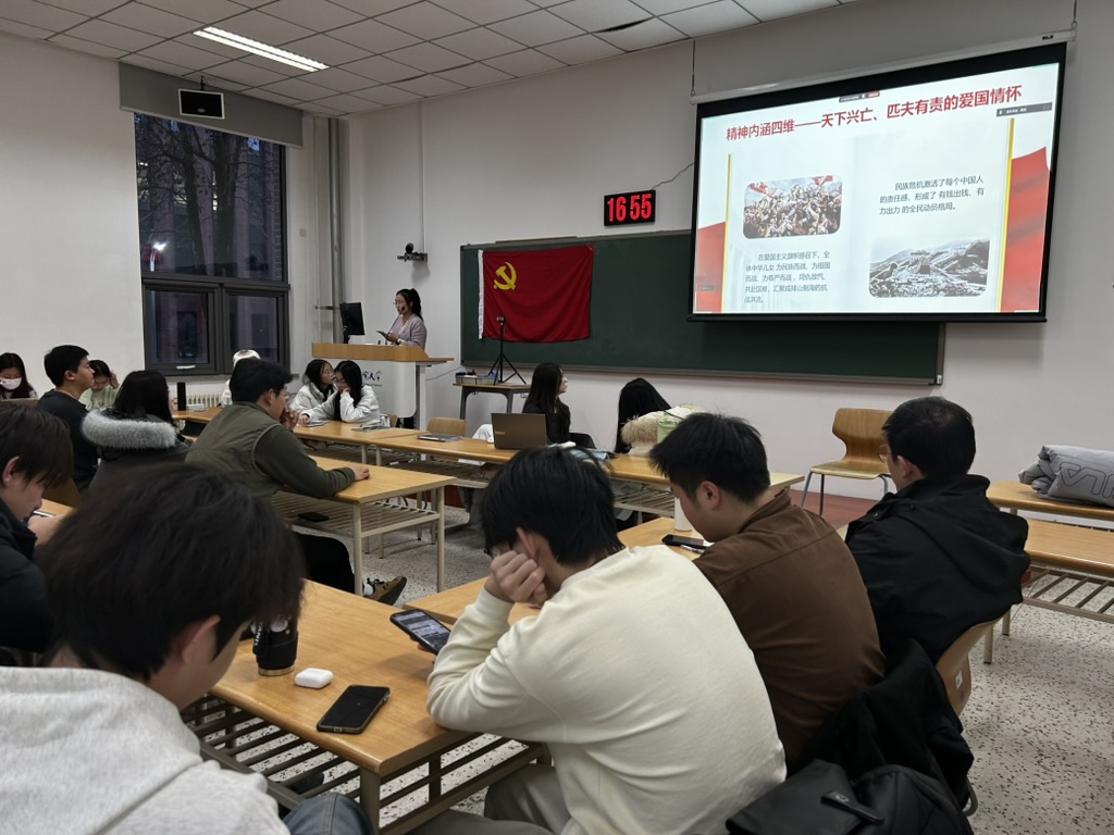 2025年12月26日,化工学院20252102党支部在教二楼121教室开展“支部书记讲党课”活动。本次党课以“弘扬伟大抗战精神,勇担时代青年使命”为核心主题,带领全体党员深悟伟大抗战精神内涵,凝聚奋进新征程的青春力量。
